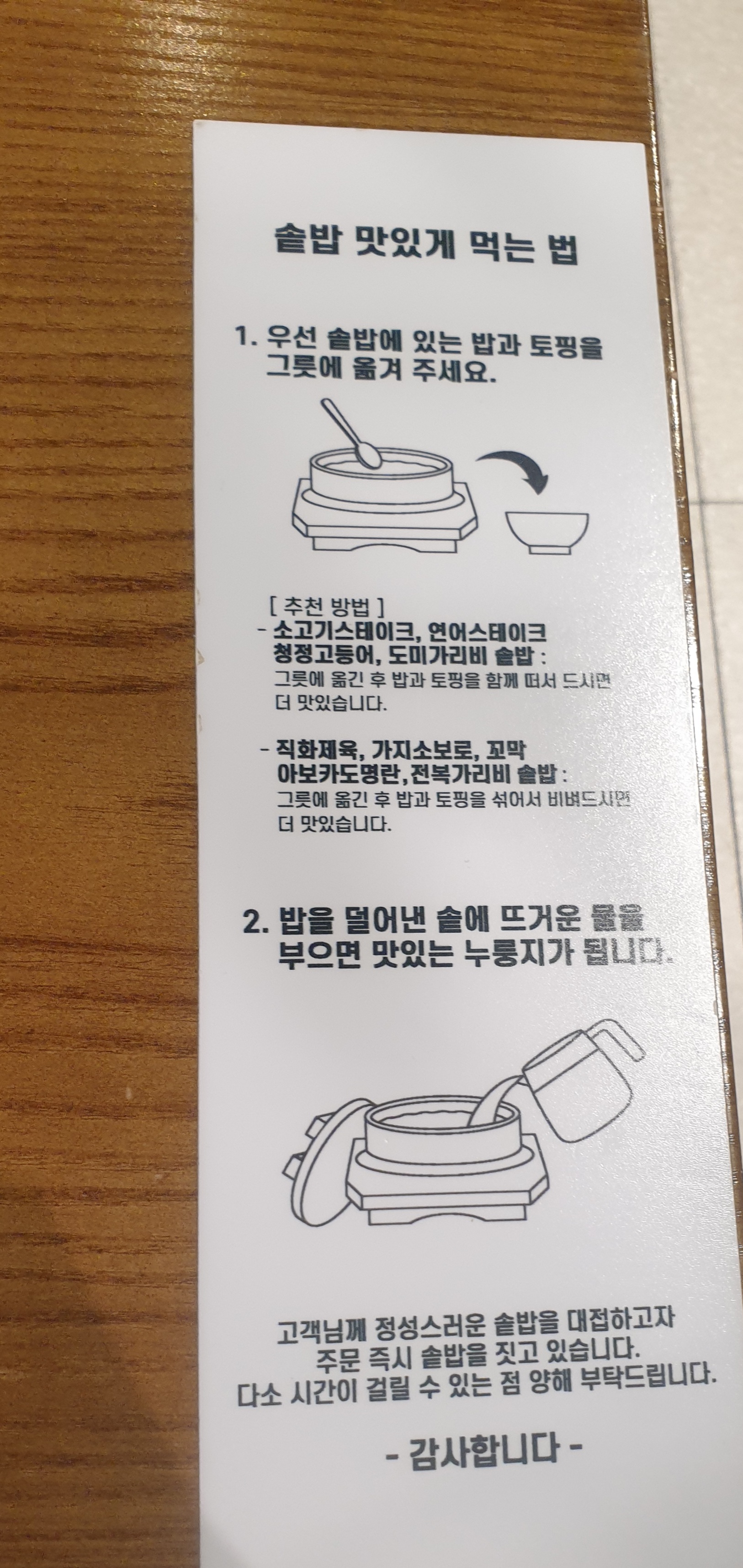 테이블마다 이렇게 솥밥 맛있게 먹는 안내문이 붙어 있어요.