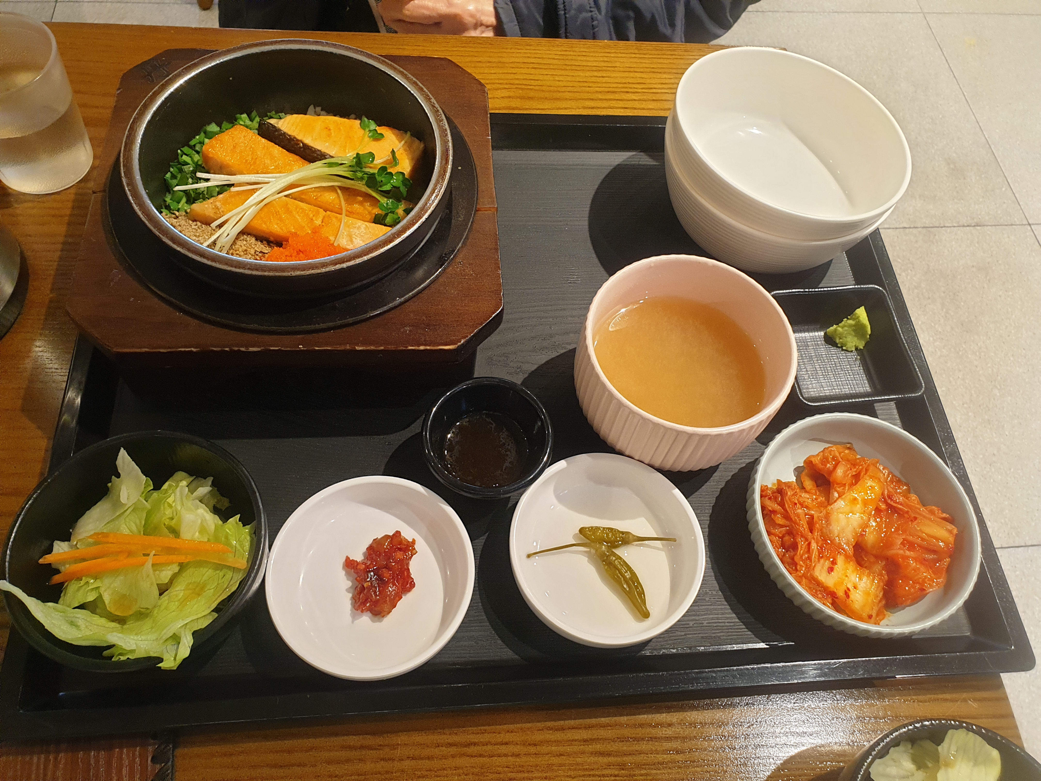 솥밥에 연어스테이크도 넉넉하고 잔파를 송송 썰어 토핑으로 올려 비린내도 안 나고 맛있어요. 연어와 밥을 옆에 빈 그릇에 덜은 다음 뜨거운 물을 솥에 부어 뚜껑을 닫은 다음 누룽지로 먹는데, 처음에는 생선 비린내가 나지 않을까 의심했는데 비린내도 없고 누룽지로 만들어져 좋네요.