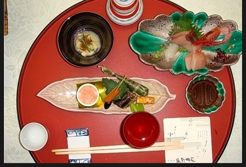 온천료깐에서 준비한 일본 전통 저녁식사 중에 맨처음 나온 사시미, 해물 등 전채 코스.