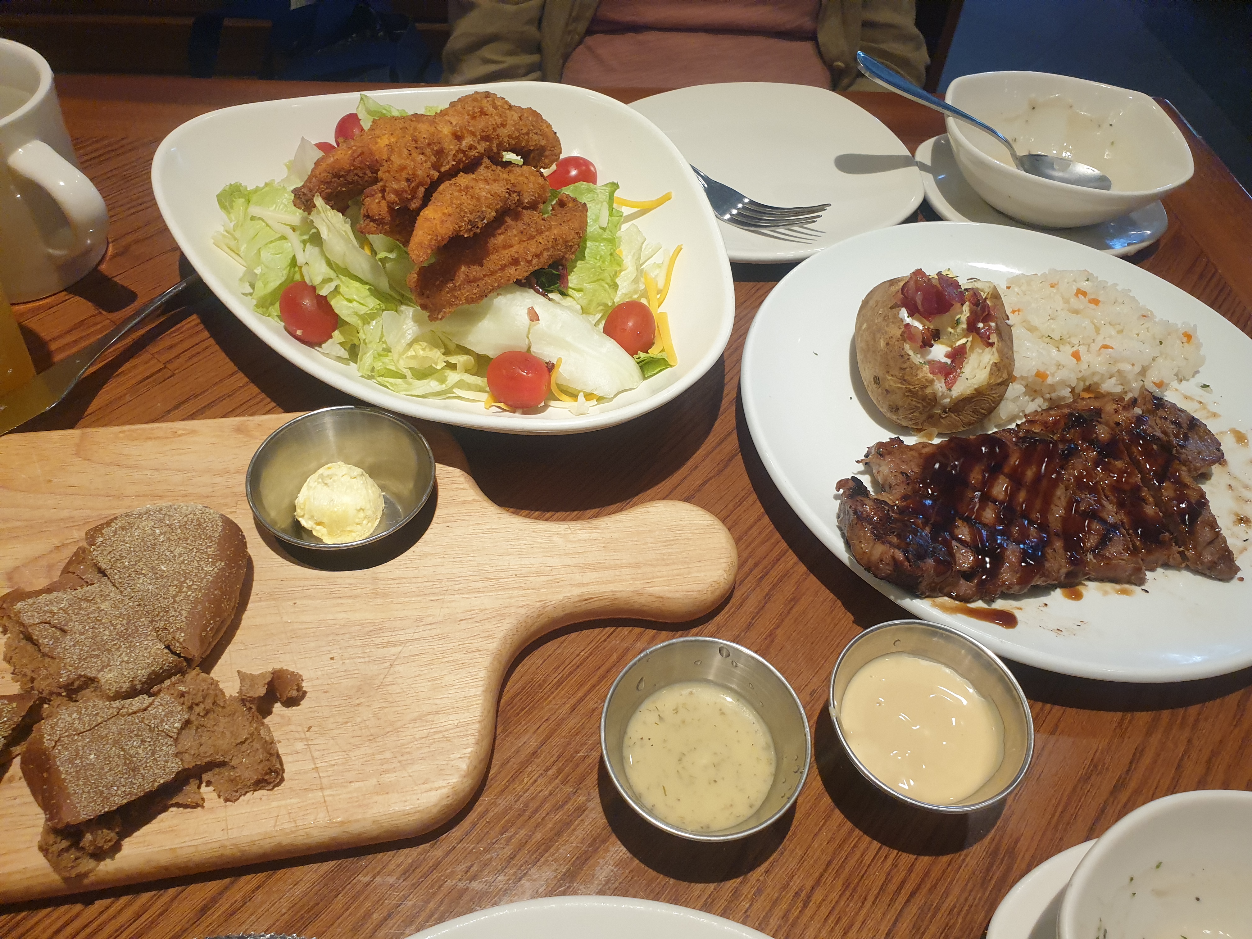 우리는 치킨 텐더 샐러드와 짐붐바 스테이크를 주문했습니다. 사이드는 양송이수프와 베이크드 포테이토, 볶음밥, 그리고 망고에이드와 레모네이드를 시켰습니다. 시내에서도 가끔 아웃백을 이용했지만 채소들도 신선하고 치킨텐더도 갓 튀긴 듯 부드럽고 스테이크도 정말 맛있게 먹었네요. 포만감에 만족해서 일어나려고 하는데 스태프 분이 후식으로 커피가 나온다고 해서 커피까지 맛있게 먹었네요. 역시 스테이크는 아웃백이 가성비도 있고 맛있는 것 같습니다.