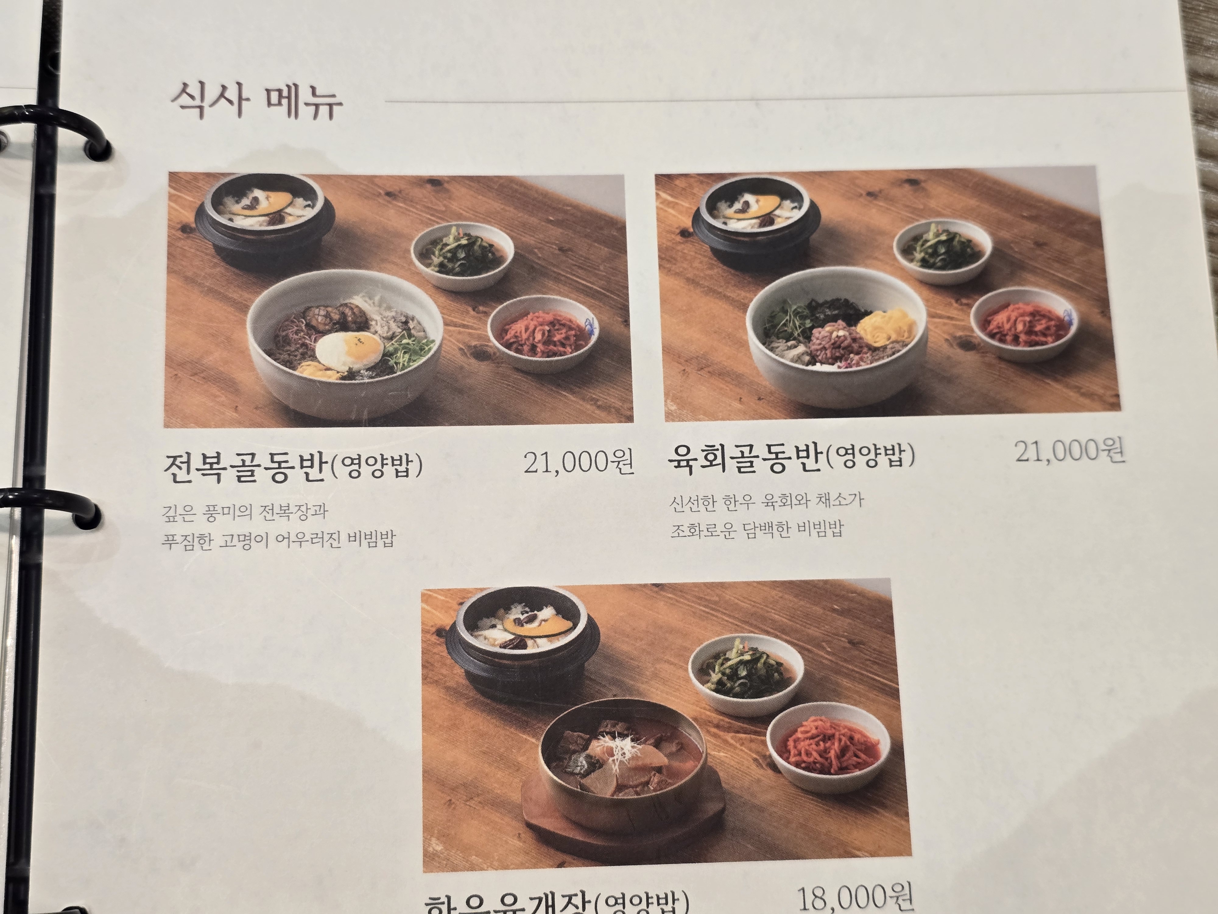 냉면 좋아하는 분들은 원래 겨울에 즐기는 음식이라던데 저희는 추위를 많이 타서 그냥 골동반비빔밥(21000원)을 주문했어요. 오픈 당시에는 없었던 메뉴인데 최근에 생긴것같아요. 비빔밥은 전복과 육회 두종류인데 전복을 선택했어요. 전복은 간장으로 양념된 전복장조림 맛이네요. 나물대신 표고버섯, 무나물, 계란지단, 소고기, 김가루 등으로 구성되었어요