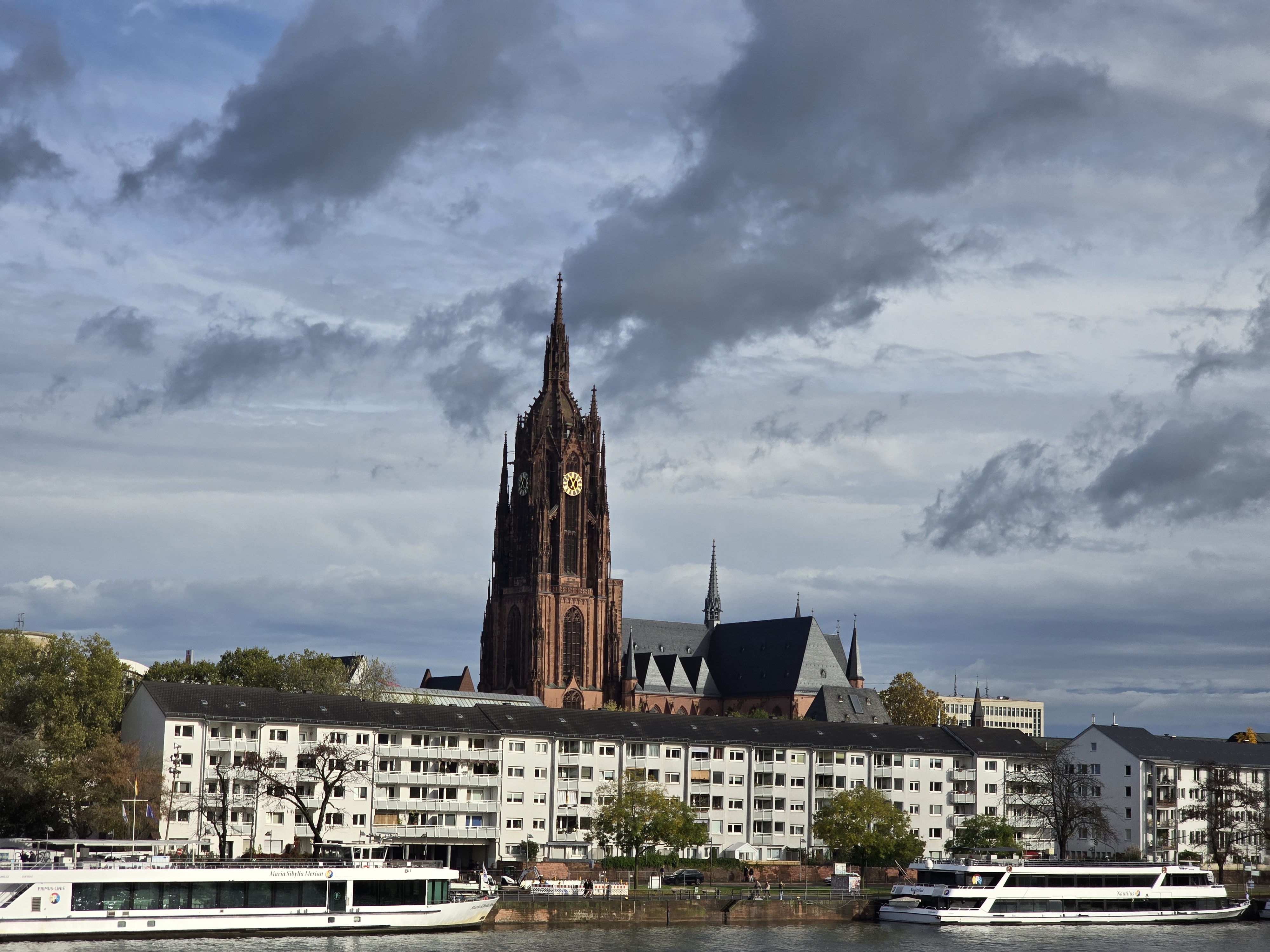 아이젤러 다리 위에서 보니 더 멋진 프랑크프루트대성당. 대형 유람선들도 많이 정박되어 있네요.